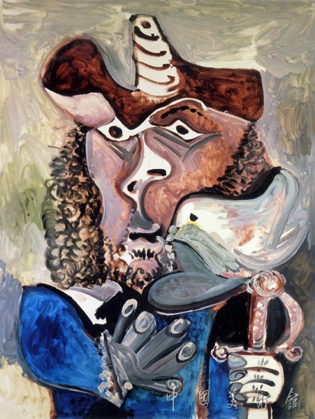 畢加索一生中風(fēng)格變幻莫測(cè),關(guān)于他的各種藝術(shù)難題至今仍無(wú)人能夠完整解讀。1967年以后的畢加索在風(fēng)格上繼續(xù)創(chuàng)新的同時(shí),在題材上卻一直對(duì)“步兵”形象情有獨(dú)鐘——深埋在畫家靈魂深處的“西班牙情結(jié)”愈老愈精神,“步兵”形象卻隨著畫家死神的臨近而漸趨衰頹,就象這位《帶鳥的步兵》。