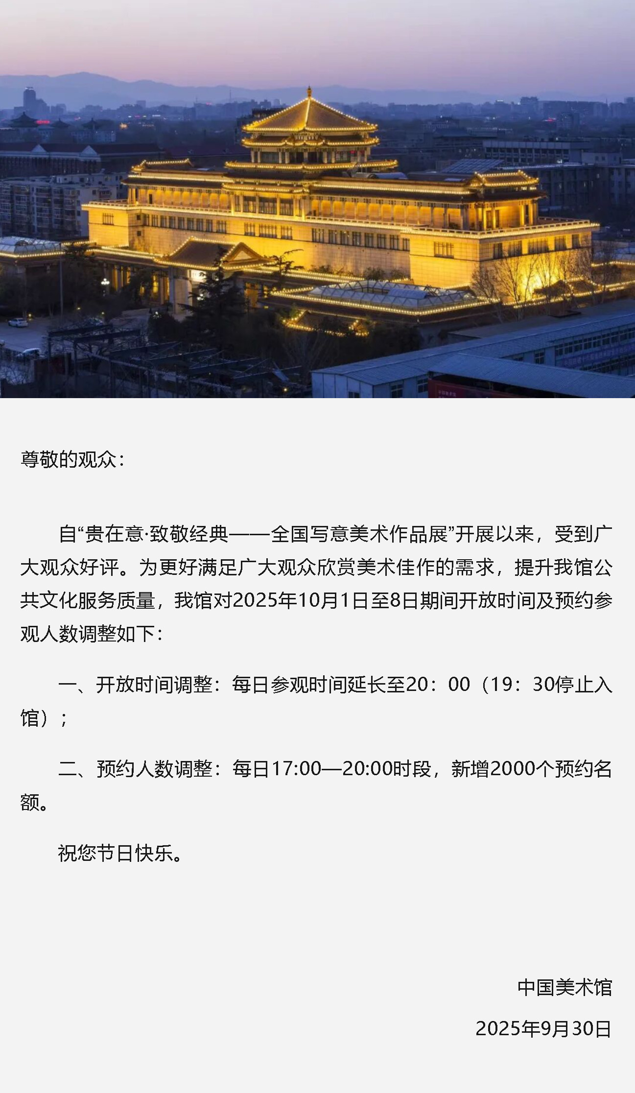 中國美術(shù)館關(guān)于國慶中秋假期增加夜場參觀的公告