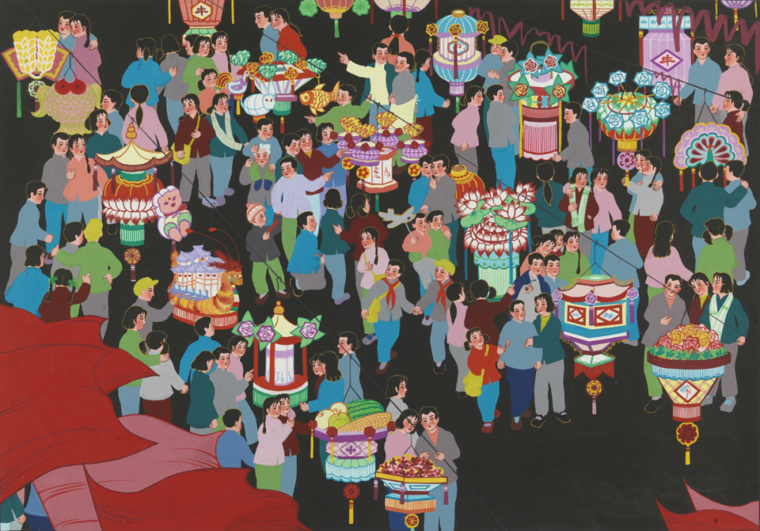 《元宵之夜》描繪了人們?cè)谠?jié)夜晚游覽賞燈的場(chǎng)景。畫面尺幅不大,僅有0.6平方米。但在這有限的幅面上,作者描繪了80多個(gè)人物、20多盞彩燈,形成密不透風(fēng)的畫面布局,恰當(dāng)表現(xiàn)出歡樂祥和、共度佳節(jié)的氣氛。這件農(nóng)民畫作品,人物造型明顯受到傳統(tǒng)工筆仕女人物畫的影響。尤其是在面部塑造時(shí),作者巧妙采用傳統(tǒng)工筆仕女人物畫的開臉方法,表現(xiàn)了人們興高采烈的內(nèi)心活動(dòng)。與傳統(tǒng)工筆仕女畫相比,這件農(nóng)民畫作品在人物造型上進(jìn)行了大膽創(chuàng)新,一掃傳統(tǒng)仕女畫人物造型的孱弱精巧之風(fēng),準(zhǔn)確表現(xiàn)出勞動(dòng)人民的健康大方。畫作以紅、黃、藍(lán)為色彩主體,巧妙使用補(bǔ)色的對(duì)比關(guān)系,形成視覺語言的張力,取得熱烈而不艷俗的藝術(shù)效果。