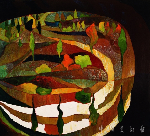 80年代以后,漆畫的創(chuàng)作日趨繁榮,形成了福建、四川、廣東、北京、江蘇、江西、天津等創(chuàng)作中心,并各具特色。天津以鋁板漆畫最為著名,其漆畫多以鋁板為胎板,運用鋁板腐蝕的方法使平整的板面形成凹凸不平的線條,畫面富有裝飾感。黃維中是天津漆畫家,他的漆畫《山和水》就是以鋁板為底胎,在黑色的背景上,以艷麗的紅、黃、綠等色彩,巧妙地利用山水的倒影,形成新的圖式。他的作品不注意寫實性,而是充分發(fā)揮漆畫的材料美與工藝美,正如他自己所言:“追求傳統(tǒng)和當代意識的和諧結(jié)合,在手工藝和純繪畫的夾縫中尋找自己的世界?!秉S維中,生于1930年,福建尤溪人,1956年人中央工藝美院裝飾繪畫系?,F(xiàn)為天津畫院畫師。