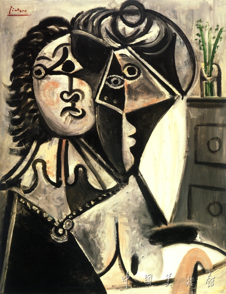 作為20世紀(jì)最偉大的藝術(shù)家,畢加索一生都在不停地變換著創(chuàng)作風(fēng)格,用他自己的話說(shuō),是對(duì)風(fēng)格的不斷地“發(fā)現(xiàn)”。在創(chuàng)作《花瓶邊的男人和女人,半身像》時(shí),畫(huà)家已89歲。但從畫(huà)家對(duì)作品中人物的臉部等部位的處理手法來(lái)看,我們依然可以找到他早期的立體主義風(fēng)格的影子。