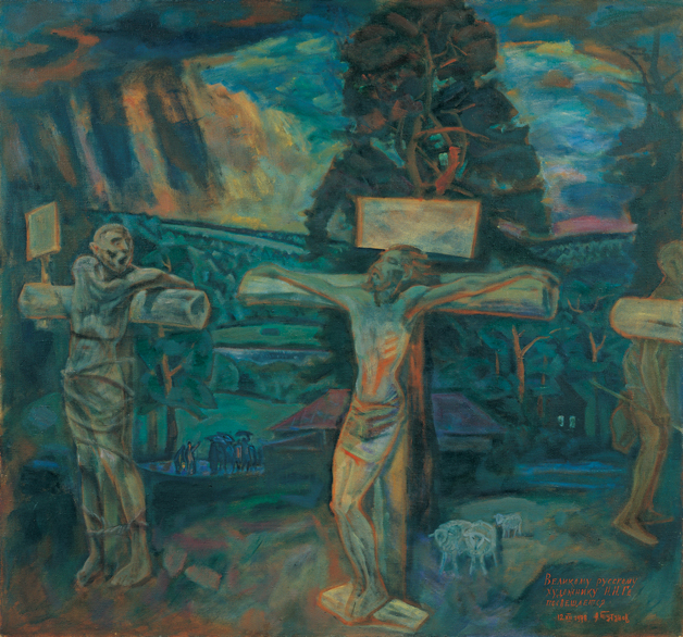 安德烈·圖圖諾夫,1928年生于莫斯科;1940年在莫斯科繪畫學(xué)院學(xué)習(xí);1948年在莫斯科國立蘇里科夫美術(shù)學(xué)院學(xué)習(xí);在莫斯科生活和工作。作品表現(xiàn)的兩個(gè)被束縛在十字架上的男人。處于畫面中心的人物清楚地表明是基督。他的胳膊松松地搭在橫木上,頭向后靠著,眼睛閉著,整個(gè)身體看起來完整無損,因?yàn)榭床坏饺魏蝹?。左邊的男人被綁在十字架上,頭朝著基督的方向轉(zhuǎn)去,面部緊張,大張著嘴,好像要對基督喊些什么。兩個(gè)十字架上都釘有木牌,但沒有寫字。畫面右邊露出十字架的一部分,其后有一個(gè)手持長棍的人。背景中可以看見樹林和林中的房屋。在房屋旁邊有一群撐傘的人,他們夾雜著手勢好像在宣揚(yáng)或者議論著什么。圖圖諾夫在他的畫作中主要使用暗、暖色調(diào)突出感情、渲染氣氛,描述了一個(gè)好的強(qiáng)盜與基督之間戲劇性的對話。圖圖諾夫受過俄羅斯古典及蘇聯(lián)現(xiàn)實(shí)主義繪畫的訓(xùn)練。他在二十世紀(jì)七十年代是一個(gè)藝術(shù)家小組的成員。這一小組主張?jiān)谧髌分斜憩F(xiàn)浪漫的因素及民族的傳統(tǒng),而這與當(dāng)時(shí)普遍提倡的社會(huì)主義繪畫藝術(shù)是相違背的。圖圖諾夫致力于成為一名偉大的風(fēng)景畫家,他的畫反映了他的天性、情感及世界觀,通過對基督教題材的描繪,表達(dá)了他與古老的俄羅斯民間藝術(shù)密不可分的情感,盡管這種藝術(shù)從斯大林時(shí)期起就不受歡迎。