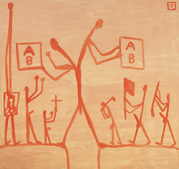 A.R.彭克(拉爾夫·溫克勒),1939年生于德累斯頓;1953年至1954年,師從約爾根·伯特赫爾(施特拉瓦爾德)學繪畫;1955年至1956年學習廣告繪畫;1980年離開民主德國;1988年在杜塞爾多夫藝術學院版畫系任教;在都柏林、倫敦和杜塞爾多夫工作和生活。這一繪畫在紅色的背景前表現(xiàn)了七個紅棕色的小人。其中形體最大的人位于畫面中央,是一個擁有四條胳膊和兩個腦袋的男性。這一分裂的形體以其雙腿跨越在深谷之上,兩個軀體各舉一塊寫有“AB”字樣的牌子,分別轉向兩側面對正在做著各種活動的其他幾個人體。畫面右側的三個男性形體,分別扛著工具、舉著旗幟和槍,這一切表示著人類活動的工作、勝利和斗爭。畫面左側的三個形體就其比例和表現(xiàn)而言表現(xiàn)出很大的不同,其中最小的一個手持基督教象征的十字架,中間的一個高舉雙臂(也許是表示投降的手勢),畫面左沿最大的一個在體前拿著塊牌子。署有“AB”文字的牌子在所有形體中引起不同反應。彭克生動地以這種方式表明了不同種族、國別和政治文化背景下的人民對同一時間的處置方式必然有其不同的立場。彭克的繪畫具有自發(fā)的特點和任意性,簡潔概括的形體表現(xiàn)方式不僅使人回憶起兒童畫,而且也使人聯(lián)想到史前的洞窟壁畫和遠古時代的繪畫形式。這幅畫屬于被藝術家看作“世界畫像”或“制度畫像”的作品群體。在這一作品群體中,他對人類交往的范疇有深入的研究。他草擬了有明顯標記的一些繪畫,人與人之間的關系,比如愛情、侵略、奮斗、征服或獨立等以少量的常用簡略符號來清楚地說明。這樣,在強烈的抽象和典范的形式中,在相似的語言記號中,闡述了作者的基本態(tài)度和處置方法,從而把欣賞者帶入沉思。彭克說:“呈現(xiàn)在我眼前的是人類社會的一種物理現(xiàn)象?!?彭克是藝術家的筆名,其真正的名字是拉爾夫?溫克勒。他的筆名來源于萊比錫十九世紀著名的冰河時代研究家和地質(zhì)學家阿爾布萊希特?彭克的名字,因為他把彭克從事的科學基礎研究看作與他自己所從事的藝術工作同樣重要。