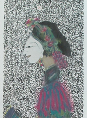朱振庚在尋求現(xiàn)代水墨的開(kāi)拓路徑中,從民間藝術(shù)中汲取創(chuàng)新的營(yíng)養(yǎng),此幅作品運(yùn)用彩墨語(yǔ)言與民間皮影造型相結(jié)合,使古老的皮影藝術(shù)中樸拙的造型之美在彩墨語(yǔ)言的激活下,以一種展新的藝術(shù)樣式呈現(xiàn)在世人面前,既有現(xiàn)代審美意趣又有歷史積淀的厚度。作者所選取的形象是媒婆,粉白的臉是戲曲中彩旦人物角色的暗示,紅綠搭配的服裝具有鮮明的民間特色,在畫(huà)法上,畫(huà)家強(qiáng)調(diào)書(shū)寫(xiě)性,即使設(shè)色也是筆筆寫(xiě)出,再以白線提醒,這種設(shè)色法來(lái)自于古老的傳統(tǒng)畫(huà)法,《考工記》中提出 “畫(huà)繢之事,后素功”即為此法。畫(huà)面的背景全以行草書(shū)鋪滿,內(nèi)容并無(wú)實(shí)際意義,只是作者作為一種構(gòu)成的元素豐富畫(huà)面的內(nèi)容,這也成為朱振庚獨(dú)特的繪畫(huà)語(yǔ)言。