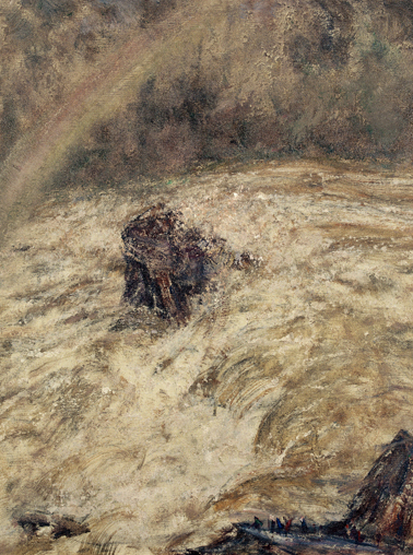 作品《虎跳峽》給人以“未見其峽,先聞其聲”的震撼,隔著畫面就能感受到江水如雷聲般的轟鳴,響徹山谷。江水推搡著、翻卷著、跳躍著、呼喊著,顯露出桀驁不馴的本性。江水猶如萬馬奔騰、千蟒勁舞、鋪天蓋地翻滾而來,江水的“動”與岸邊人的“靜”形成鮮明對比。在畫面的“快”與“急”中,緊抓畫面細(xì)節(jié),從而使其生動明快,可見其對事物瞬間的捕捉與表達(dá)。在用筆中,融合中國畫中擦、皴、擺等畫法,在輕、重、緩、急中彰顯其功力,突出其情感。