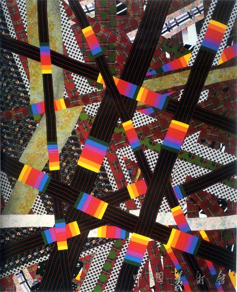這是一幅極具表現(xiàn)力的裝飾性拼貼畫。畫面最底層是紅、白、黑三色的細(xì)碎花布,它們對比鮮明,密而有序,快樂活潑,充滿生機(jī)。處于畫面中間層次的是一些灰色與白色的碎布片——由于它們的存在,整個畫面顯得空闊、疏落而富有立體感。畫面最外層則是幾條橫貫整個畫幅的帶有色相變化和細(xì)紅條紋的黑色長布條,它們與作為底襯的各色碎布相比,顯得很有氣勢、縱橫開闊。