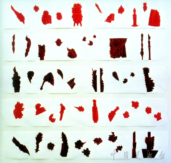 畫面上有五條由符號(hào)排列組成的橫幅,白色的橫幅上有規(guī)律地排列著一系列紅色和棕色的符號(hào)。符號(hào)的形態(tài)各異,大小不等,并具有齒狀的邊緣,符號(hào)的輪廓用金線均勻地勾勒出。這些謎一樣的符號(hào)到底代表著什么呢?它讓人聯(lián)想起古埃及的象形文字,似乎在用敘事性的符號(hào)式語言訴說一個(gè)故事。畫家本人對該神秘符號(hào)的解釋是:一個(gè)人的內(nèi)心世界不可能輕易被別人讀懂。