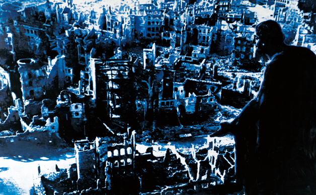戈特弗里德·赫冷魏恩,1948年生于奧地利維也納;1969年至1973年為各種不同的雜志、畫報(bào)畫畫;1977年在美國逗留7個(gè)月;與瓦西里·肯迪斯基·迪斯納發(fā)生激烈爭論;1979年參與“國際兒童年”活動(dòng);1985年移居德國,徹底地改變藝術(shù)工作,從事大型的和由幾部分組成的繪畫工作;在布爾格布珞爾生活和工作。觀眾的目光從上邊落到了德累斯頓內(nèi)城的廢墟上。在陰暗中一些關(guān)著窗口的殘墻碎壁聳入高空。在畫的右側(cè)邊緣有一個(gè)女性,她好像在不知所措地望著眼前灰暗的畫面,左手茫然地?cái)傞_著。實(shí)際上,這個(gè)女性是教堂屋頂上的一尊雕像。這幅作品顯示了在第二次世界大戰(zhàn)中遭到炸彈嚴(yán)重破壞的德累斯頓城,在那次戰(zhàn)爭中這座城市有十萬人喪生。這使人追溯到德國攝影師里夏德?彼得在一九四五年拍攝的著名的真實(shí)歷史照片。赫冷魏恩以特殊的方式對這個(gè)樣品進(jìn)行移植。人們會(huì)對這幅深藍(lán)色的畫感到驚奇,但它仍舊突出了這座被摧毀的城市的陰冷氣氛。如果為了更仔細(xì)地觀察其細(xì)微部分而接近這幅畫時(shí),原始的真實(shí)照片就變?yōu)槟承o關(guān)聯(lián)的藍(lán)色斑點(diǎn)了。赫冷魏恩以這種逗弄的解析法,使觀賞者用自己的眼光經(jīng)歷一次這座城市的摧毀過程。這件作品屬于表現(xiàn)戰(zhàn)爭場面、飛機(jī)墜毀和遭到破壞的城市的災(zāi)難的系列畫。赫冷魏恩首先拍照了這個(gè)系列,然后又描繪了這個(gè)主題。這個(gè)系列畫是對人類的所作所為造成的一切摧毀物的寫照。
