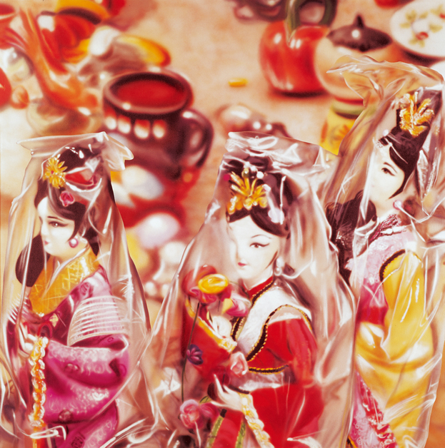 本·施恩采特,1942年生于紐約的布魯克林;1960年在紐約庫柏聯(lián)合學(xué)校學(xué)習(xí);1964年作歐洲之旅;1966年在布魯克林大學(xué)任講師;在紐約生活和工作。現(xiàn)實主義攝影家本?施恩采特在其巨幅畫中以大量的剪裁手法來展示櫥窗或商店柜臺里的不同物品。畫面前景中是三個透明包裝的中國玩偶,背景中是其他包括杯子、盤子、瓷器等待售商品。從這些物品可以判斷出售的商品可能來源于在美國的一家中國紀念品商店。這些物品色彩斑斕,它們之間并沒有什么緊密的聯(lián)系,而僅僅是放在壁爐臺上或者玻璃板上的小擺設(shè)。乍看上去這幅畫像是一張巨大尺寸的照片,但細看人們就會發(fā)現(xiàn)過渡清晰的前景與模糊的背景之間的強烈反差。兩者之間并不像通常照片那樣有一個過渡。這就使得作品產(chǎn)生前后兩個不同的畫面層次,中國的玩偶如同貼上去一般。作為現(xiàn)實主義的攝影家,本·施恩采特用不同形式來捕捉和介紹現(xiàn)實。他的畫用噴槍及畫筆繪制而成,顯示了攝影改變現(xiàn)實的可能性,而題材受到攝影技術(shù)手段的制約,比如不斷變換焦距。這樣平常的那些角度關(guān)系就會顛倒,以致產(chǎn)生超現(xiàn)實的模糊效果。這一圖畫的“人為性”符合畫面內(nèi)容的“非自然性”。